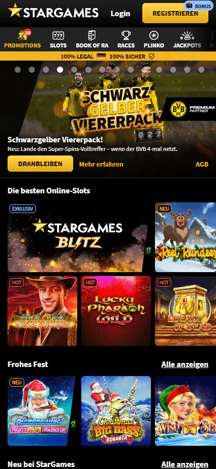 Als neuer Spieler im StarGames Casino erwartet Sie ein attraktives Willkommensangebot. Der Bonus für neue Spieler besteht in der Regel aus einem Einzahlungsbonus und zusätzlichen Freispielen auf ausgewählte Slots. Wichtige Bedingungen: