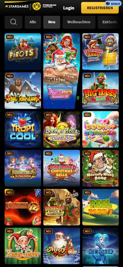 Die übersichtliche Navigation ermöglicht es, schnell zwischen Kategorien zu wechseln, Spiele in der Demo‑Version zu testen oder direkt um Echtgeld zu spielen. Filterfunktionen nach Anbieter, Einsatzhöhe und RTP helfen Ihnen, die passenden Titel zu finden. Egal ob Sie nach einem großen Jackpot, schnellen Runden oder strategischen Spielen suchen – im StarGames Online finden Sie die richtige Auswahl.
